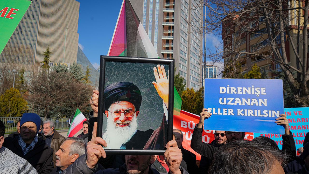 ABD’nin Ankara Büyükelçiliği önünde, İran bayrakları, Hamaney’in fotoğrafları ve “İslam’ın ve Müslümanların asıl düşmanı emperyalizm ve siyonizmdir”, “Amerika’nın özgürlük ve demokrasisi katliamdır” yazılı dövizler taşıyan kalabalık, “Kahrolsun ABD” ve “Kahrolsun İsrail” sloganları attı.